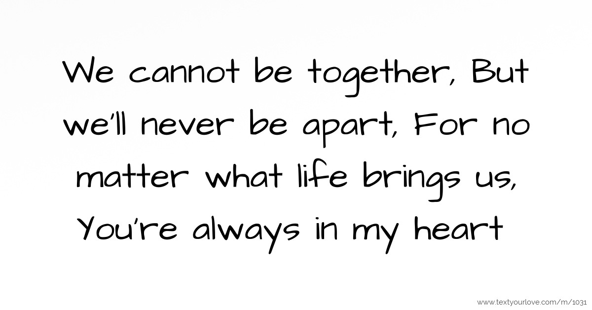 We cannot be together, But we'll never be apart, For no matter what life brings us, You're always in my heart.