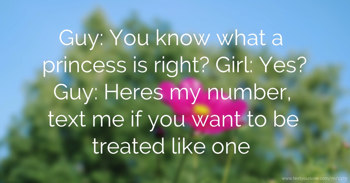 Guy: You know what a princess is right? Girl: Yes? Guy: Heres my number, text me if you want to be treated like one
