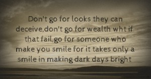 Don't go for looks they can deceive,don't go for wealth wht if that fail,go for someone who make you smile for it takes only a smile in making dark days bright.