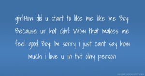 girl:How did u start to like me like me Boy: Because ur hot Girl: Wow that makes me feel good Boy: Im sorry i just cant say how much i love u in txt olny person