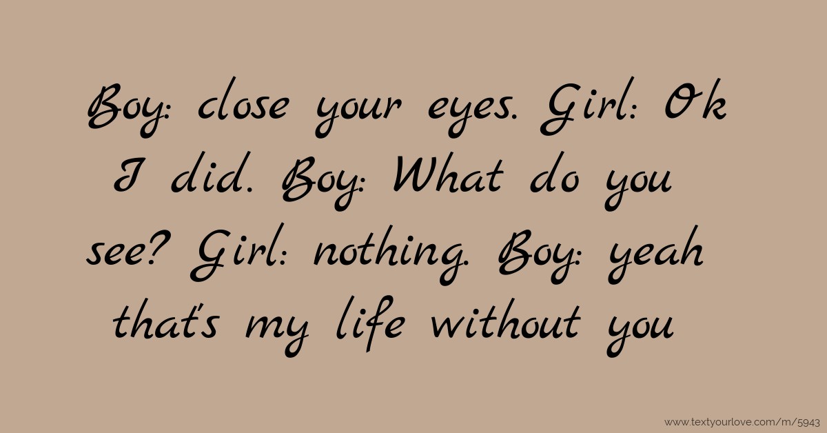 Boy: close your eyes. Girl: Ok I did. Boy: What do you see? Girl: nothing. Boy: yeah that's my life without you.