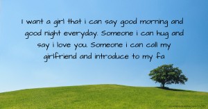 I want a girl that i can say good morning and good night everyday. Someone i can hug and say i love you. Someone i can call my girlfriend and introduce to my fa