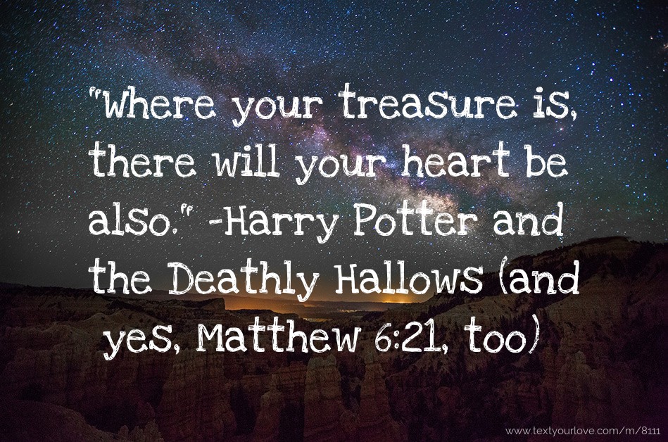 Next text message: "Where your treasure is, there will your heart be also." -Harry Potter and the Deathly Hallows (and yes, Matthew 6:21, too)"