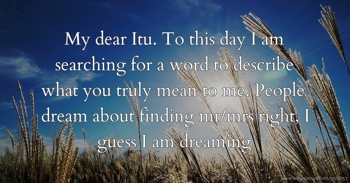 My dear Itu. To this day I am searching for a word to describe what you truly mean to me. People dream about finding mr/mrs right, I guess I am dreaming.