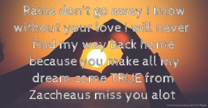 Raina don't go away I know without your love I will never find my way back home because you make all my dream come TRUE from Zaccheaus miss you alot