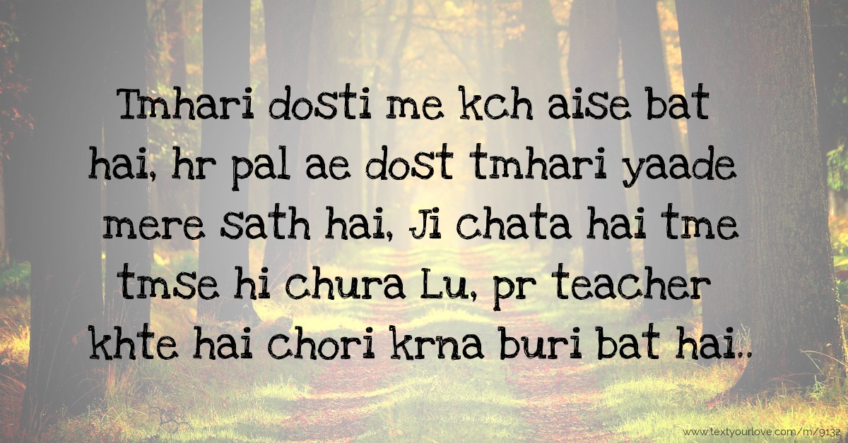 Tmhari dosti me kch aise bat hai, hr pal ae dost tmhari yaade mere sath hai, Ji chata hai tme tmse hi chura Lu, pr teacher khte hai chori krna buri bat hai..